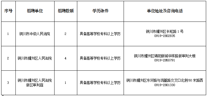 全市法院共招聘聘用制書記員7名,各法院招聘職位、地址及政策咨詢電話詳見《銅川法院2023年面向社會公開招聘聘用制書記員職位表》(附件)。