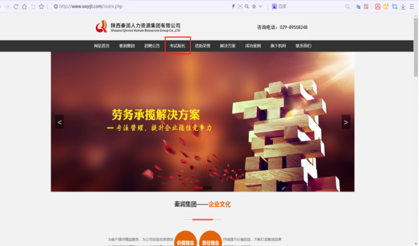 1.登錄陜西秦潤人力資源集團(tuán)有限公司官網(wǎng)(網(wǎng)址:http://www.lfwch.com/),點(diǎn)擊“考試報(bào)名”。